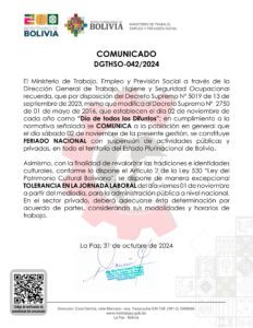 “Se comunica a la población en general que el día sábado 2 de noviembre de la presente gestión, se constituye feriado nacional con suspensión de actividades públicas y privadas, en todo el territorio del Estado Plurinacional de Bolivia”, indica el documento.